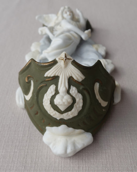 Bientôt disponibleAnge bénitier mural ancien en biscuit