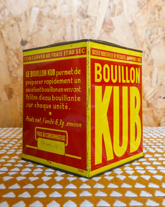 Ancienne boîte KUBOR, métal jaune et rouge, style rétro