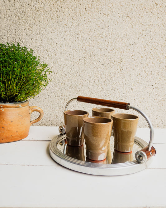 Plateau miroir vintage avec anse en métal et bois, design années 50