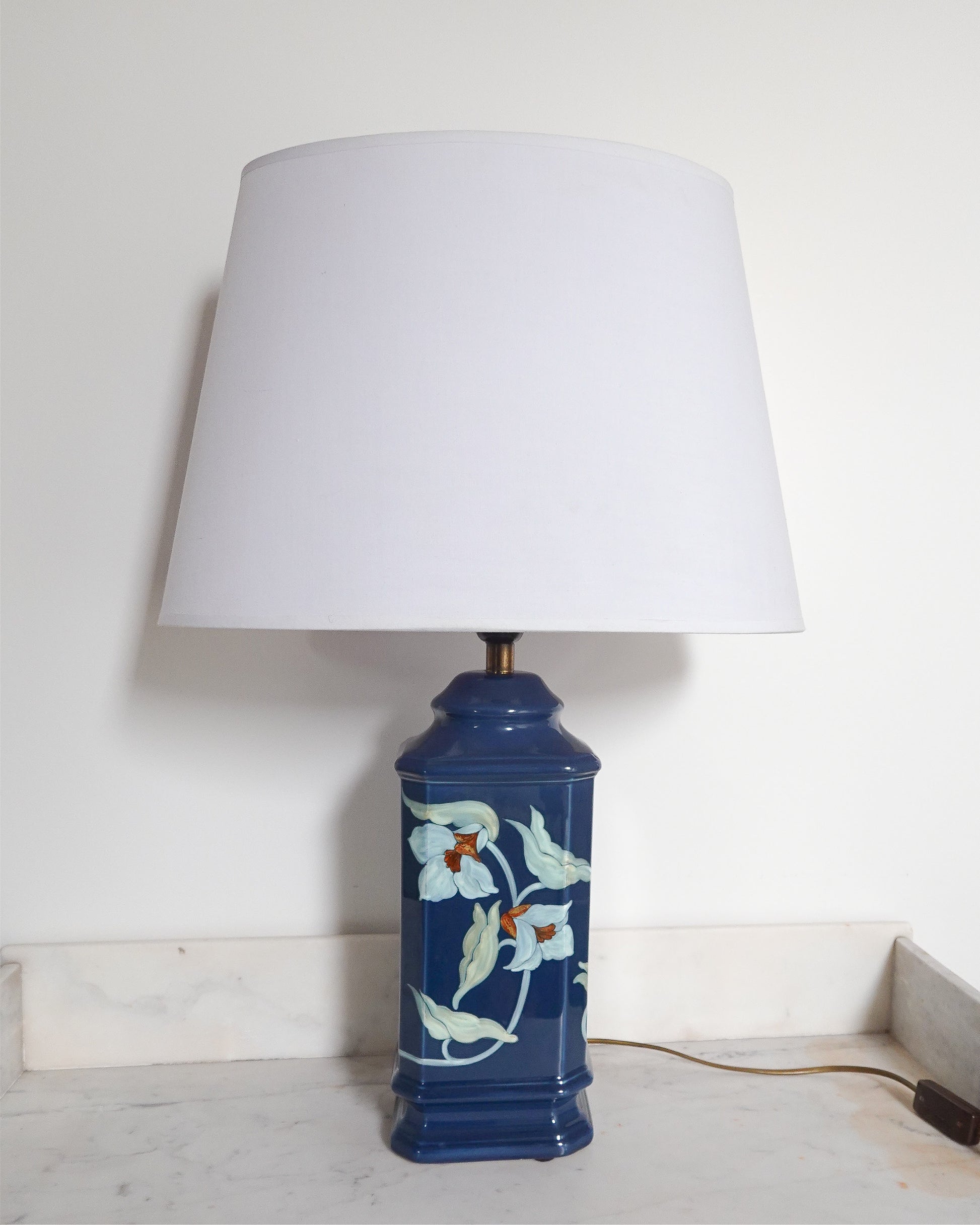 Ce pied de lampe en céramique, orné de motifs floraux, est signé Drimmer et fabriqué en France. Sa teinte bleu délicat et ses motifs floraux sur chaque face en font une pièce décorative unique. Parfait pour apporter une touche vintage et chaleureuse à votre intérieur, il fonctionne avec une ampoule E27 et une prise plate.